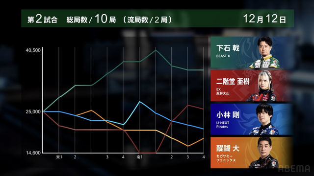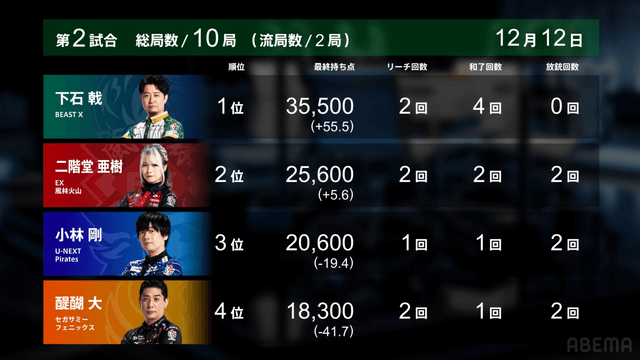 オーラスはラス目の醍醐のリーチに対して他家はオリに回り流局。下石が同日連勝のトップを獲得。