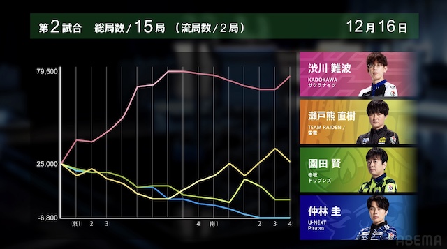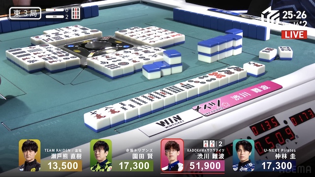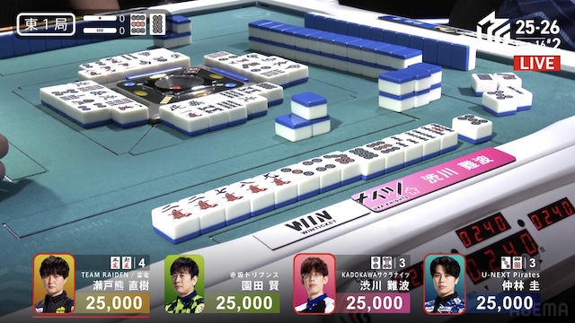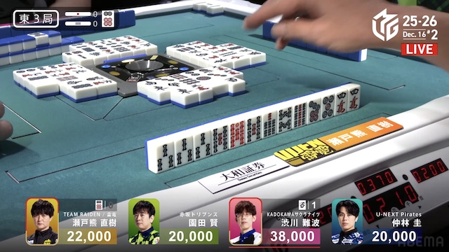 東1局、渋川が10巡目に先制リーチをかけると、同巡仲林が追いかけリーチ、さらに瀬戸熊も同巡に追いかけリーチで場が沸騰。三軒テンパイのめくり合いになった。渋川が一発でツモアガリ。3000・6000となった。