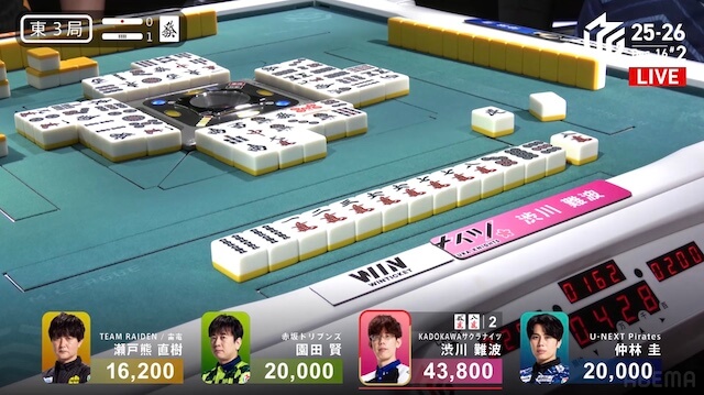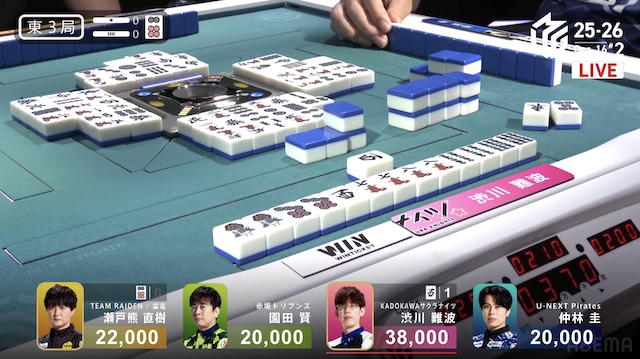 東3局2本場、親の渋川が9巡目に先制リーチ。時間はかかったものの、最終手番でツモアガリ。裏ドラを2枚乗せ、6000は6200オールとした。渋川の持ち点は7万点を超える。