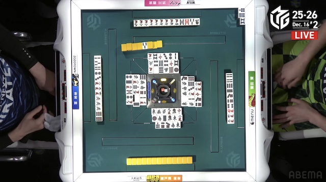 タンキのチートイツで先制リーチ。瀬戸熊が15巡目に追いかけリーチで対抗するが、カン