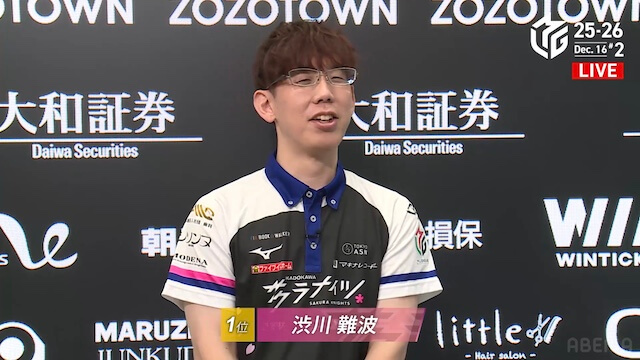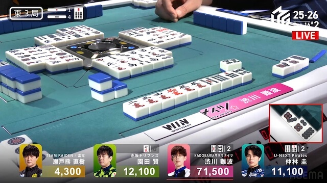 南4局、トップ目の渋川がダマテンを入れると、そのまま2着目の瀬戸熊からロンアガリ。8000点を手にし、トップ目のまま試合を終わらせた。