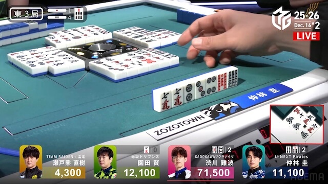 東4局、2着目の瀬戸熊が先制リーチ。4着目で親の仲林も三副露めを入れて、テンパイで対抗するが、瀬戸熊がツモアガリ。