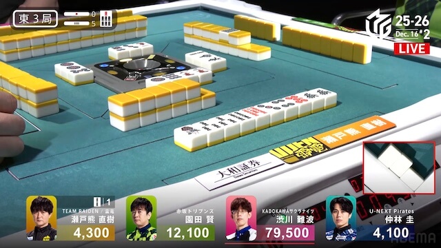 をポンしてテンパイ。さらに親の瀬戸熊も門前でテンパイを入れ、リーチで応戦した。競り勝ったのは、最後にツモ切り追いかけリーチを選択した園田。山に3枚残っていた