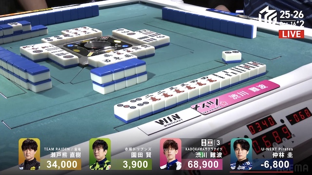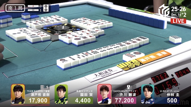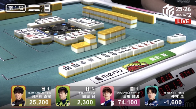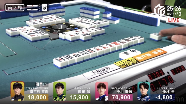 南3局、2着目の瀬戸熊が7巡目に先制リーチ。園田からロンアガリで、8000を手にした。