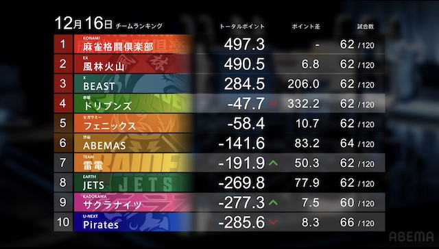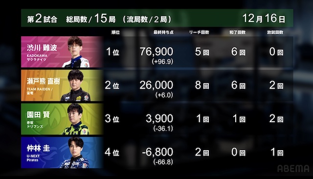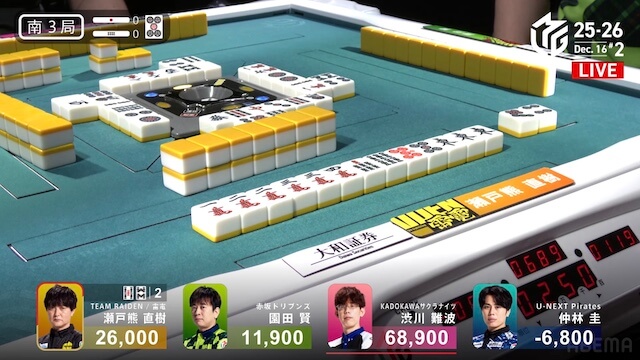 麻雀プロリーグ「大和証券Mリーグ2025-26」レギュラーシーズン54日目が12月16日(火)に開催された。