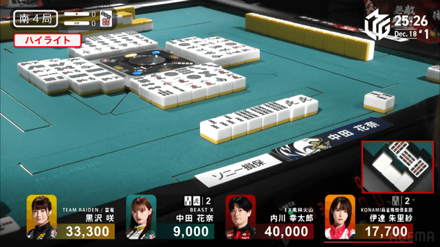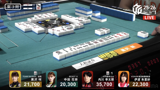 ま待ちとなるが、黒沢がツモって満貫のツモアガリ。内川と並ぶ。