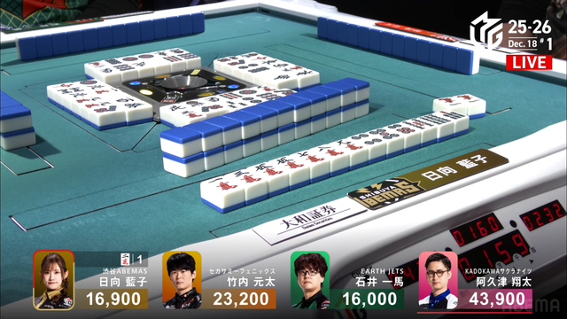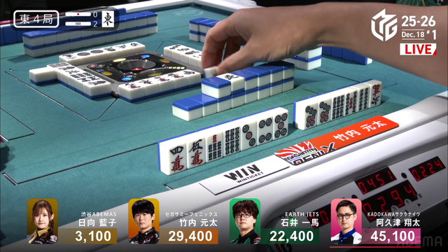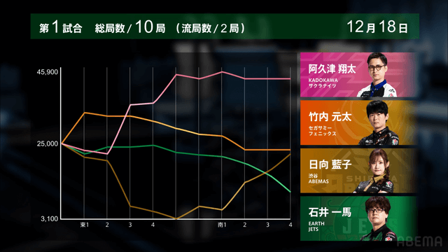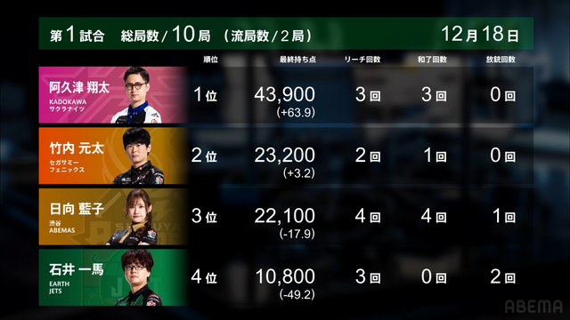 をロン、5200のアガリで3着を死守した。このアガリにより阿久津がトップを獲得した。