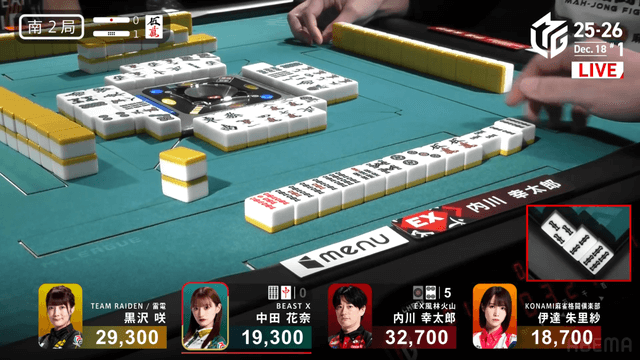 南2局1本場、親番中田のリーチをかいくぐり、内川がタンヤオ仕掛けで満貫のアガリを決め、2着目黒沢との差を広げる。