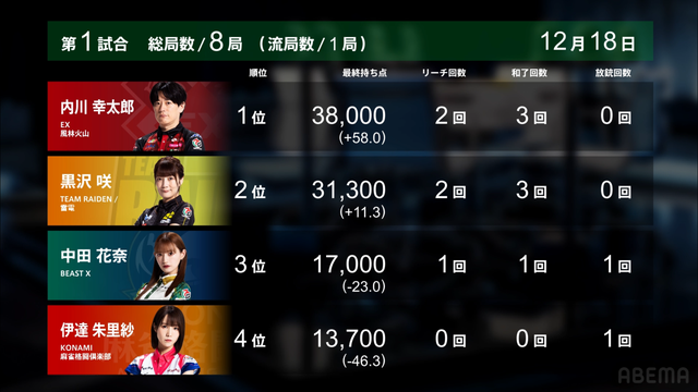 オーラスはトップ争いの内川・黒沢、4着回避を狙う伊達・中田という構図となったが、中田がホンイツ仕掛けを決め3着へ浮上。内川がトップを獲得した。
