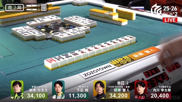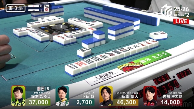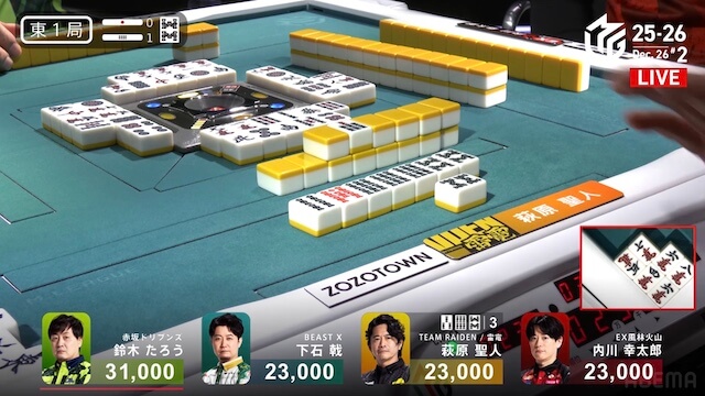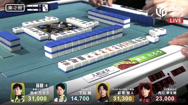 をツモりにいく。最後は、内川からロンアガリ。5200は5500を手にし、トップ目の萩原まで3800点差に迫った。