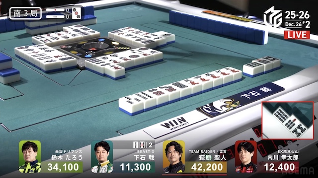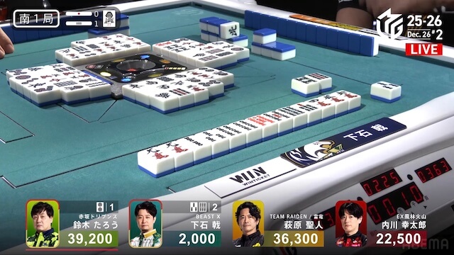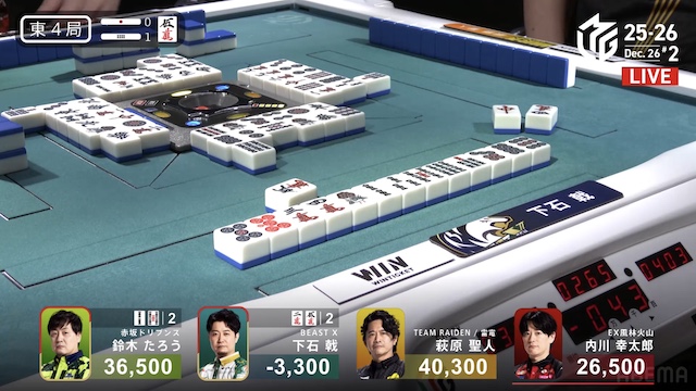 南3局、4着目の下石がテンパイを入れると、3着目の内川からロンアガリ。1000点だが、3着目と4着目が入れ替わる。
