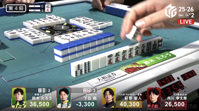 東4局1本場、4着目で箱下に沈む下石が9巡目に先制リーチ。2着目のたろうが12巡目に、追いかけリーチで応戦する。二軒テンパイによるめくり合いは、たろうがドラの