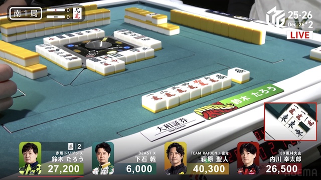 東2局、たろうが6巡目に先制リーチを打つと、一発でツモアガリ。3000・6000でトップ目に立つ。