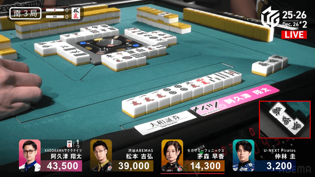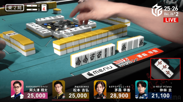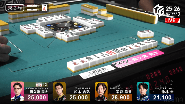 東2局、茅森が大三元・字一色のダブル役満も見える手に向かう中、阿久津が3000・6000をツモアガリ。