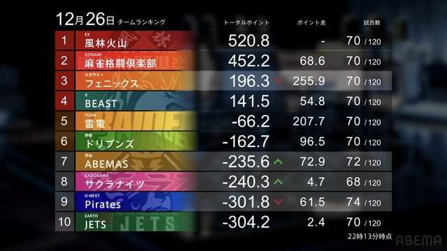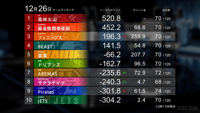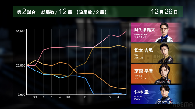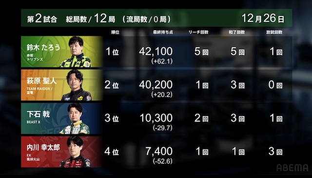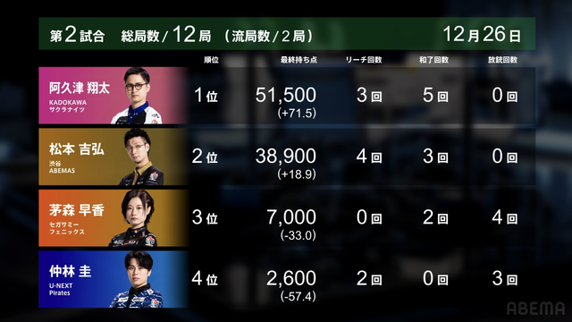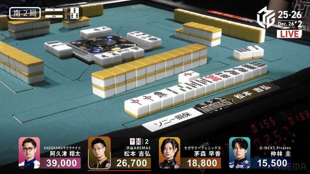 麻雀プロリーグ「大和証券Mリーグ2025-26」レギュラーシーズン60日目が12月26日(金)に開催された。