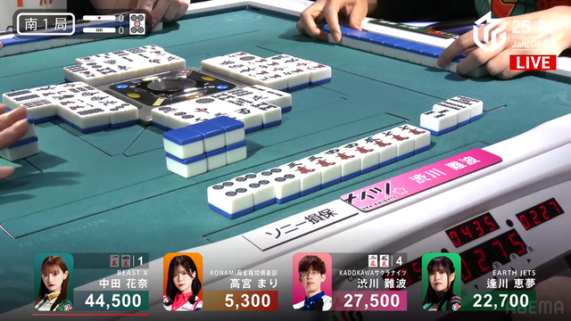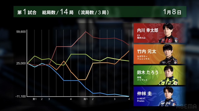 南2局、元太も親番の一発ツモで6000オールのアガリ。高打点のアガリで点数は縦長の展開に。この試合は内川が逃げ切ってトップを獲得した。