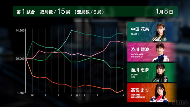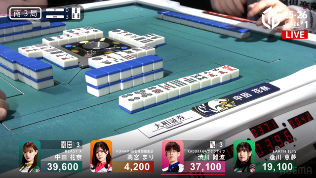 待ちでリーチを選択。しかし結果は高宮の1人テンパイで流局。着順に変動はなく、この試合は中田がトップを獲得。