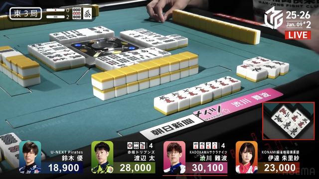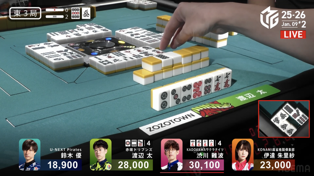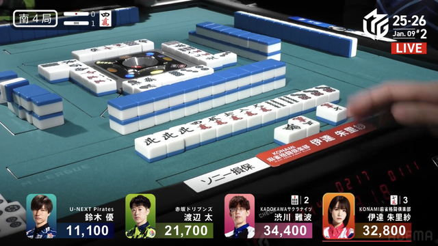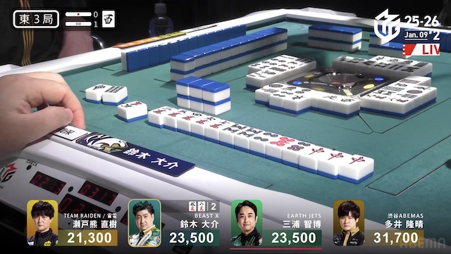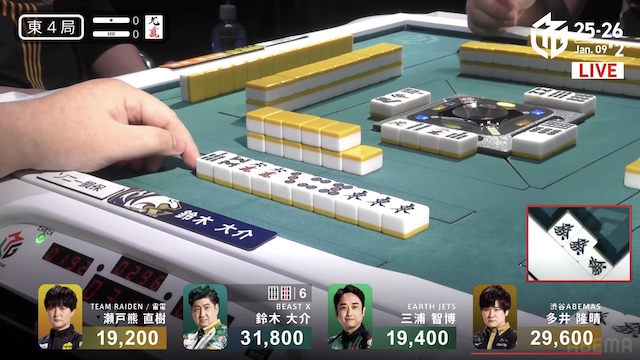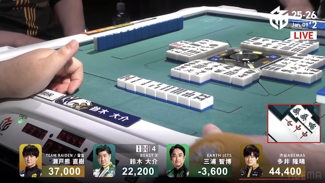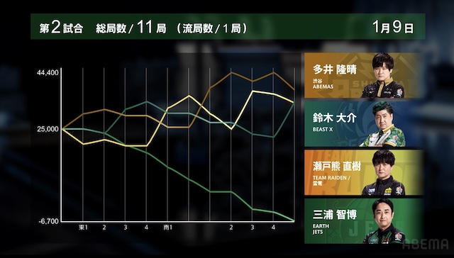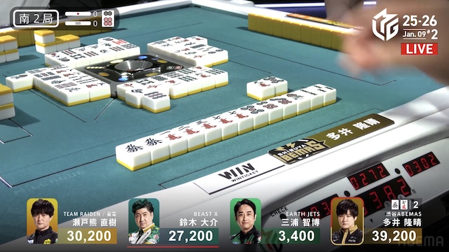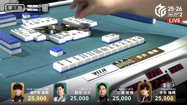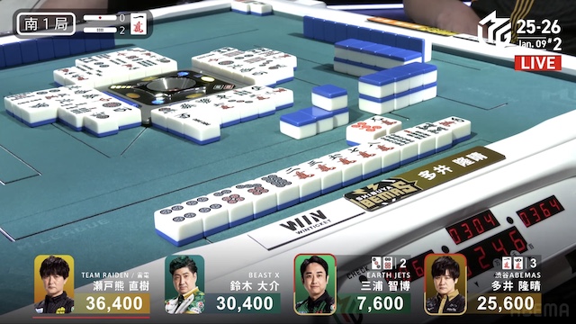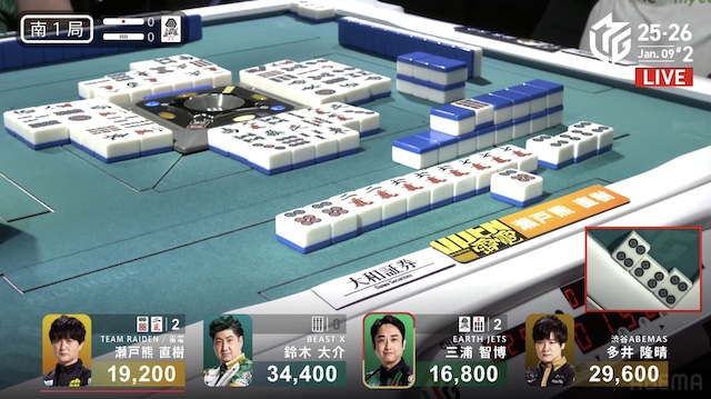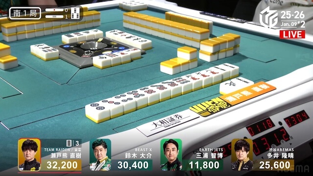 南1局2本場、三浦が高め一気通貫の先制リーチを打つと、同巡多井が三色同順確定の追いかけリーチで対抗。二軒リーチのめくり合いは、多井に軍配が上がる。ツモアガリ。3000・6000は3200・6200で親の瀬戸熊をかわし、トップ目に立った。
