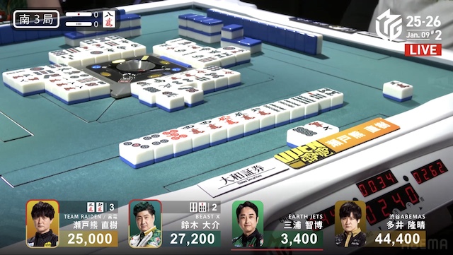 南3局、3着目瀬戸熊の先制リーチに、2着目大介が追いついてリーチで対抗する。4着目で親番の三浦は苦渋のオリを選択し、最後は瀬戸熊がツモアガリ。3000・6000で、トップ目の多井まで3400点差に迫ってオーラスへ。
