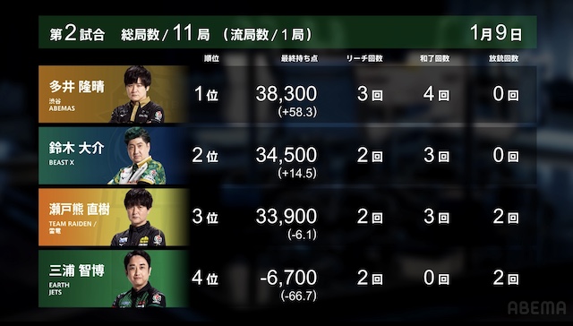 1位 多井(ABEMAS)+58.3