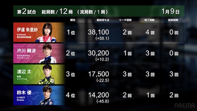 南4局2本場、4着目の優が14巡目に先制リーチ。満貫ツモでの着アップを目指す。リーチ棒が出た関係で、2着目の渋川は満貫出アガリでもトップになれる。決着は、優が最終手番でツモアガリ。ただ、裏ドラが乗らず、着順そのままでの幕切れとなった。