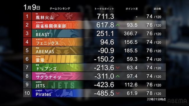 BEAST、ABEMASがトップ2着で加点に成功、ABEMASはマイナスポイントを2桁まで回復した。JETSは苦しい連続4着でマイナス400ポイントに。そろそろ終盤戦に差し掛かってくる所、徐々に巻き返していきたい所だ。