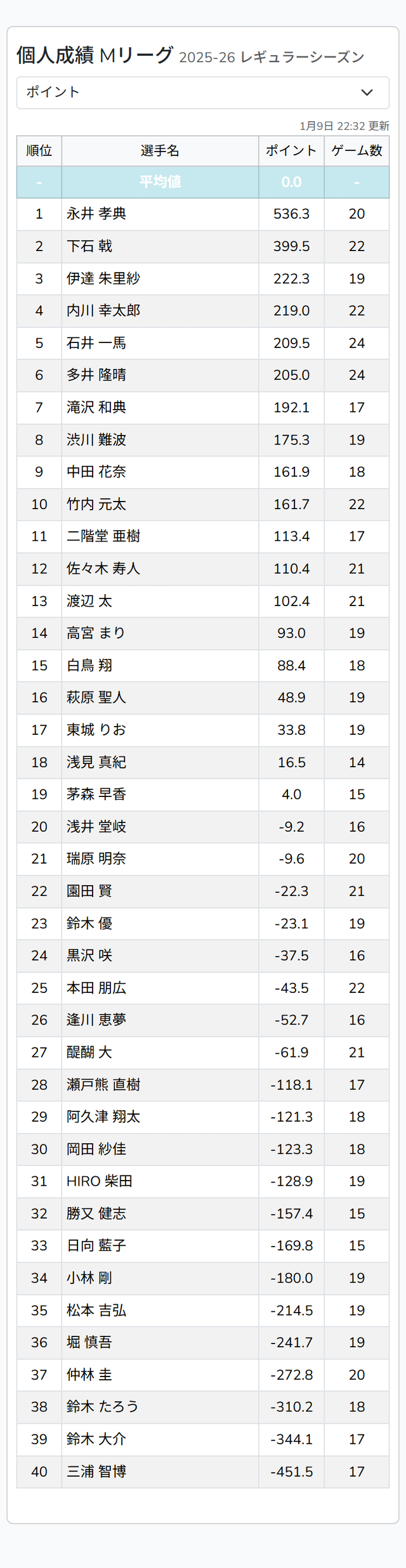 3位 太(ドリブンズ)▲22.5
