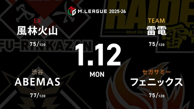 本日1月12(月)19時から「大和証券 Mリーグ2025-26」65日目が放送。第1試合出場選手が発表された。