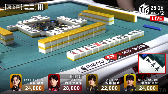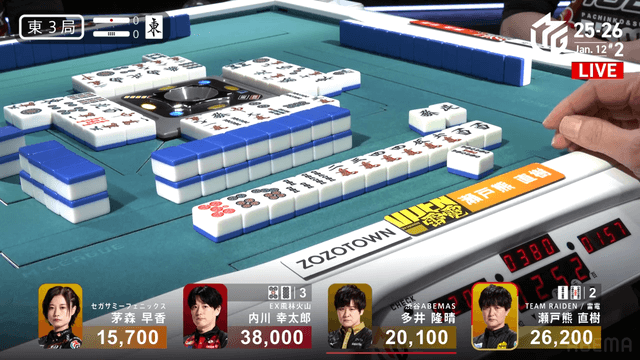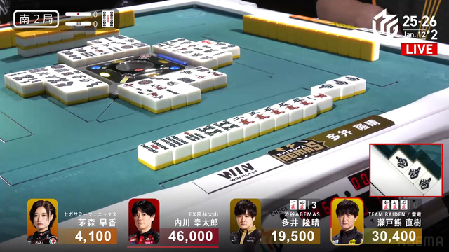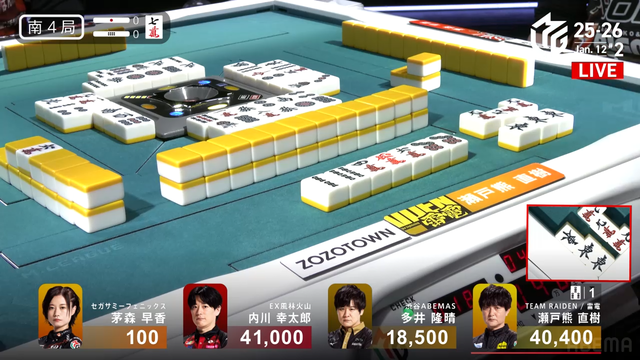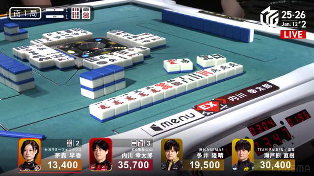 待ちで追いつく。しかし結果は内川と瀬戸熊の2人テンパイで流局。