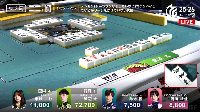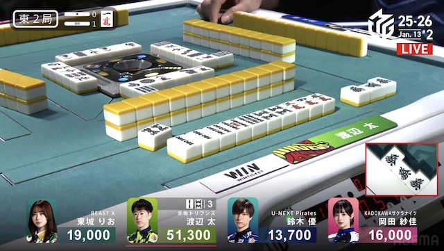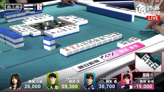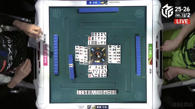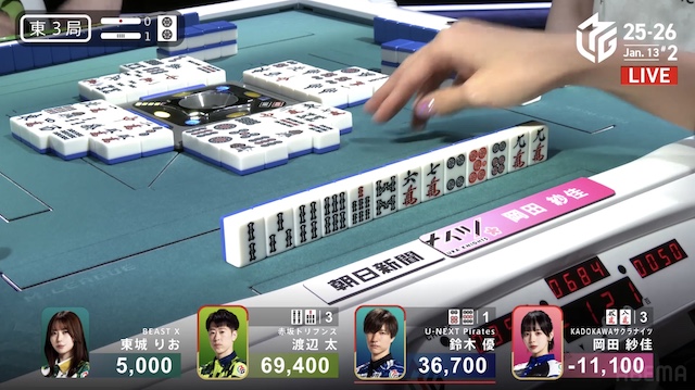 南4局、3着目の東城が8巡目に先制リーチをかけ、試合を終わらせにいく。4着目で親の岡田が追いかけリーチを打つと、一発で東城からロンアガリ。12000を手にして連荘に成功した。