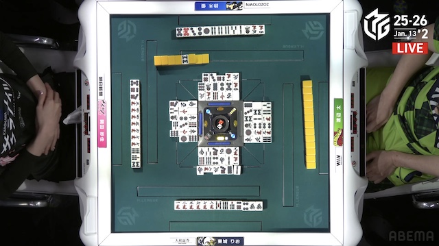 を重ねた2着目の優が、門前で追いついて、追いかけリーチで応戦する。さらに4着目の岡田も追いついて、三軒リーチのめくり合いに。しかしアガリは生まれず、流局となった。