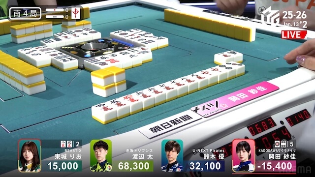 南1局2本場、供託が3本ある。4着目の岡田が、ポンしてファーストテンパイに。優からロンアガリ。2000は2600に、供託も手に入れた。