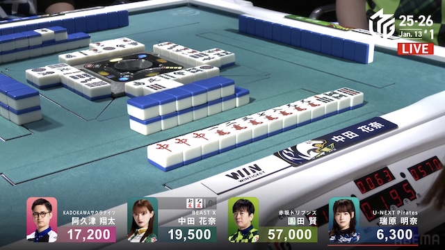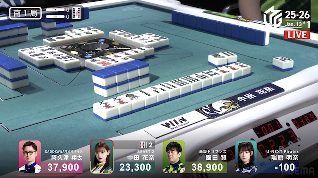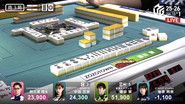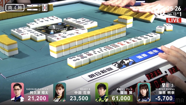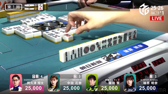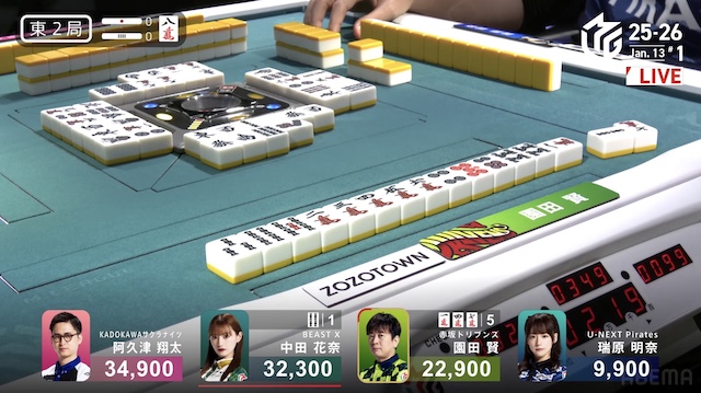 1枚分有利な阿久津が競り勝ち、瑞原からロンアガリ。12000を先取した。