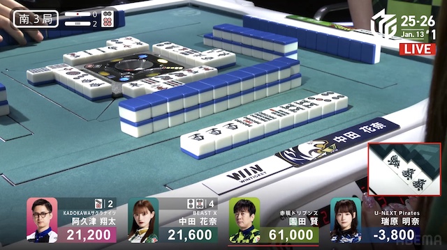 南3局2本場、2着目中田と3着目阿久津の点差はわずかに400点。中田が