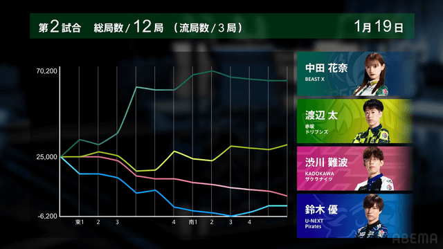 を放つと太のアガリで終局。オーラスは着順変動なくこの試合は中田がトップを獲得。