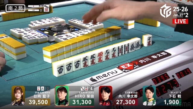 南4局、3着目の内川が先制リーチ。一発もしくは裏ドラ1枚で、2着目に浮上できる。4着目で親の下石から一発でロンアガリ。8000を手にして、2着目に浮上し、試合終了となった。