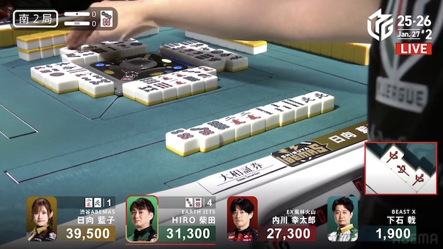 南3局、2着目の柴田と3着目で親の内川が、テンパイを入れてめくり合う。柴田が下石からロンアガリ。1000点を加点して、オーラスへ。