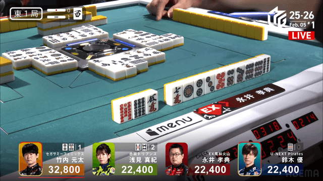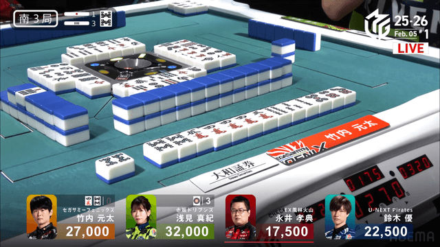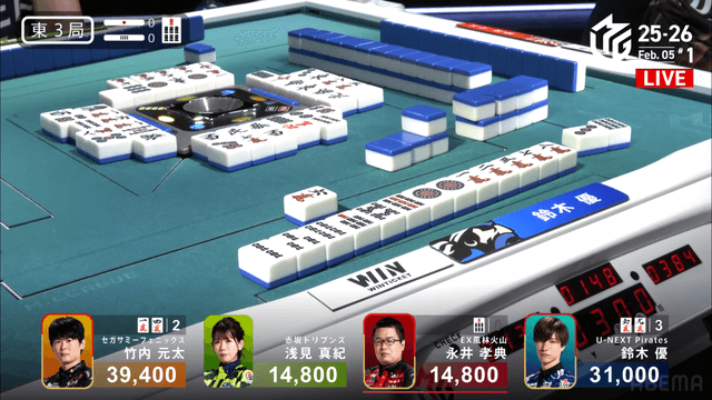 待ちで追いかけリーチでぶつける。親番浅見の最終手番、チーして海底をずらすか、山から完全安牌を引きに行くかの選択、浅見は山に手を伸ばした。この結末は優の海底ツモ、2000・4000のアガリで元太を追う。
