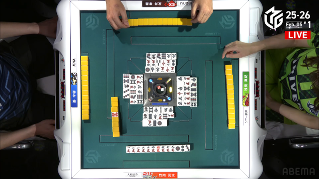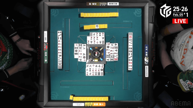 待ちの先制リーチ、リーチ時山に7枚残っているリーチだ。しかし、大介のリーチは空振りの流局。大介と一馬の2人テンパイで流局した。
