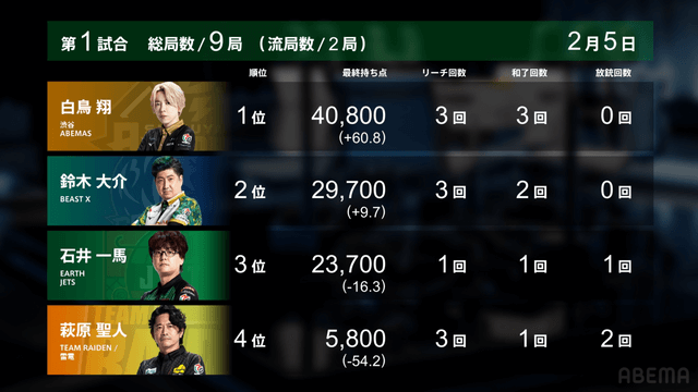 1位 白鳥(ABEMAS)+60.8