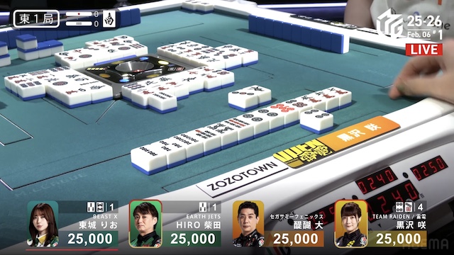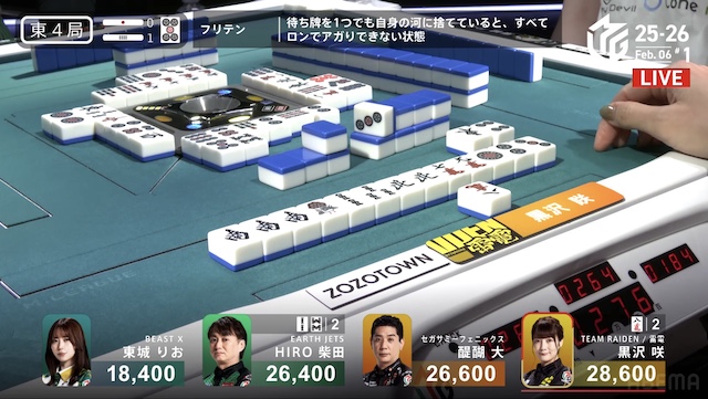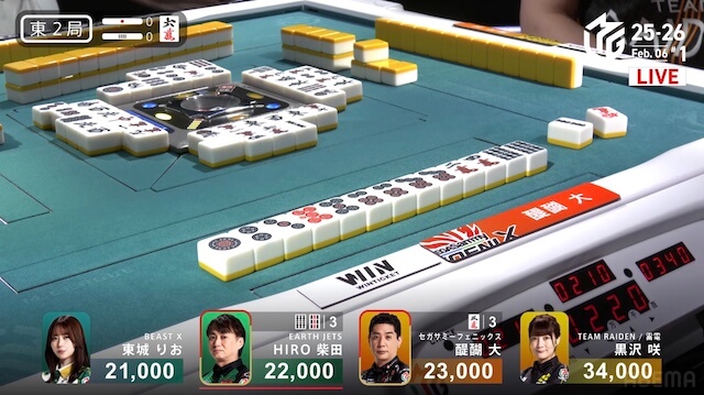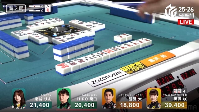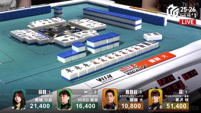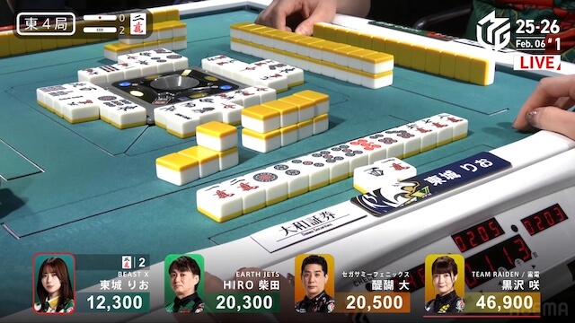 待ちの三面張リーチをぶつけていく。二軒によるめくり合いは、醍醐がオリを選択した直後、黒沢がツモアガリ。2600オールで連荘に成功した。
