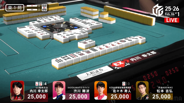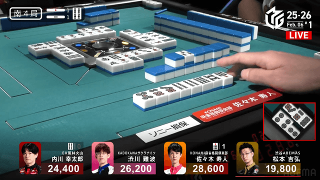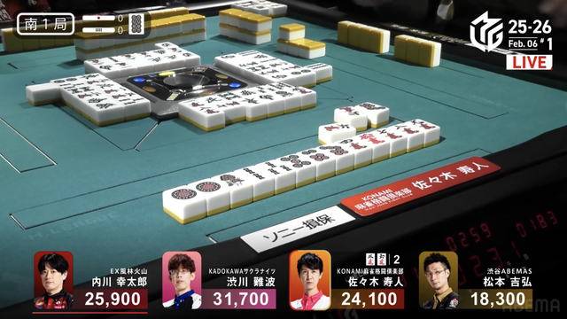 東1局、親の内川が先制リーチをかけると、寿人とのめくり合いを制してツモアガリ。裏ドラを1枚乗せて、2600オールを先取した。