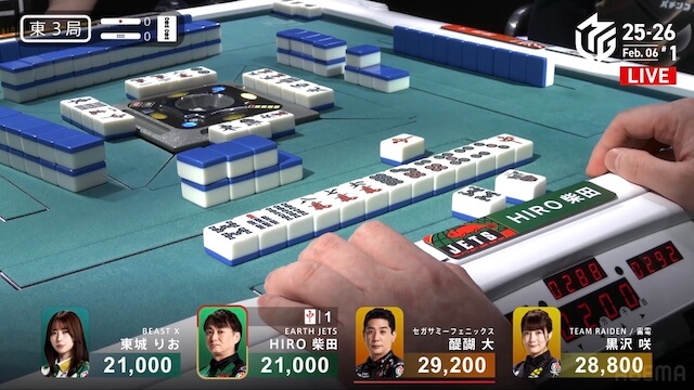 ポンから発信してソーズに向かう。しかし、門前でファーストテンパイを入れたのは醍醐。役がないのでロンアガリはできないが、ツモった時のみアガれる形に。黒沢が10巡目に先制リーチ。醍醐はテンパイを外して迂回する。柴田が門前で追いつき、追いかけリーチで勝負をかけた。さらに東城がチンイツをテンパイ。三軒テンパイの激しいめくり合いに。