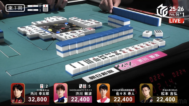 東2局、内川が9巡目に先制リーチをかけると、渋川が門前で追いつき、同巡追いかけリーチを選択。一発でツモアガリ。2000・4000は2100・4100を手にした。