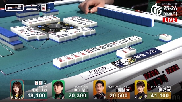 南1局1本場、親の東城、醍醐がテンパイを入れる中、柴田もテンパイを入れるものの、役がないためツモった時のみアガれる形に。三軒によるめくり合いは、柴田がツモアガリ。価値ある300・500は400・600となった。
