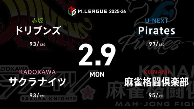 赤坂ドリブンズ vs KADOKAWAサクラナイツ vs KONAMI麻雀格闘倶楽部 vs U-NEXT Pirates