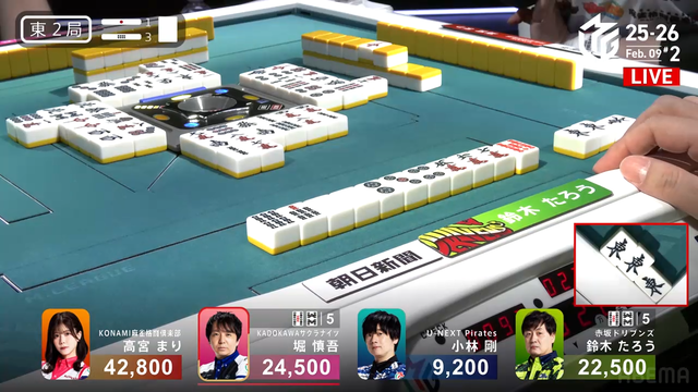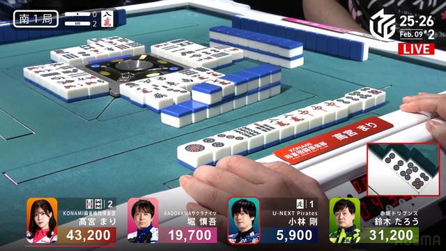 東1局2本場、堀が2副露で満貫テンパイを入れる。そこにたろうが![]()