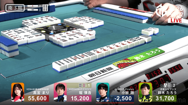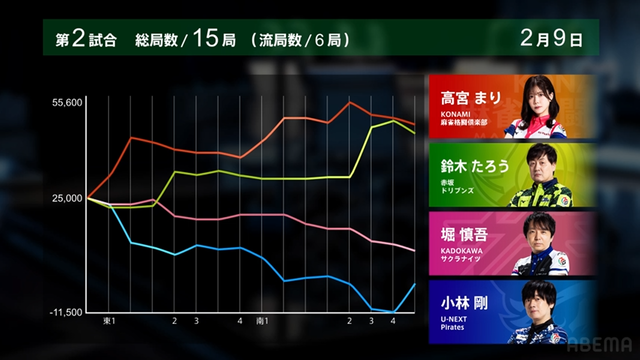 をツモると満貫のアガリとなった。この試合は高宮のトップで終局。