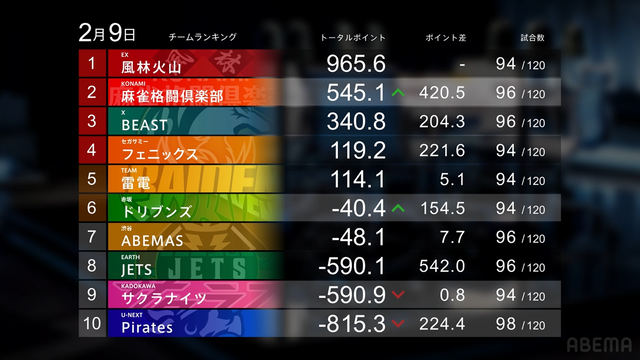 麻雀格闘倶楽部がチームスコア500を突破。ドリブンズはABEMASの上には立ったがまだまだ僅差で予断を許さぬ状況。Pirates、サクラナイツにとってはゲーム数が減った上にボーダーとのポイント差が開いてしまう苦しい結果となった。