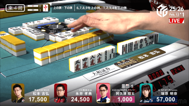 待ちのテンパイとなる。松本が最終盤にテンパイをいれるが、阿久津が